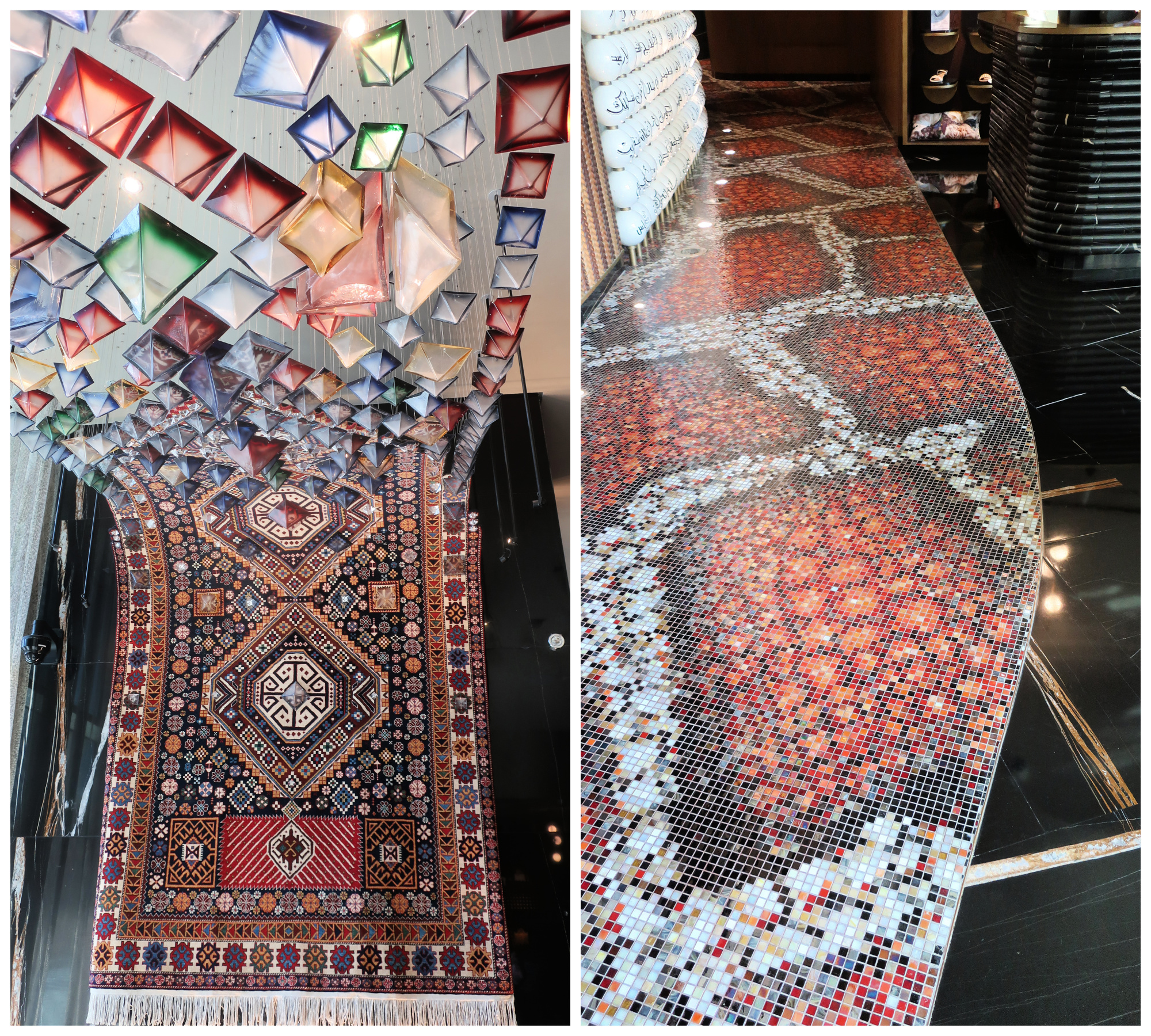 L’esprit du désert tente de s’accrocher à cet étourdissant maelström. Alors que la voilure du célèbre Burj Al Arab avait donné le ton, le récent Hôtel W illustre ce courant jusqu’à l’obsession. Ce palace high-tech entend symboliser tous les éléments emblématiques de la culture séculaire locale : au sol, la mosaïque reproduit une peau de crotale. Au mur, les éléments décoratifs célèbrent différents contes des mille et une nuits, les motifs traditionnels du tapis volant s’éparpillent jusqu’au plafond…
